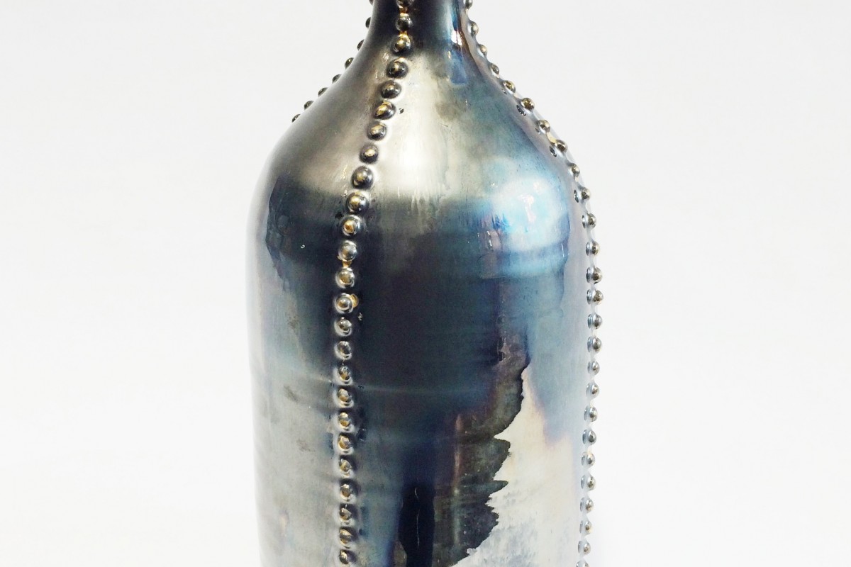Studded vessel with palladium glaze and gold lustre. The two glazes layered together created an oily look. $1000.00